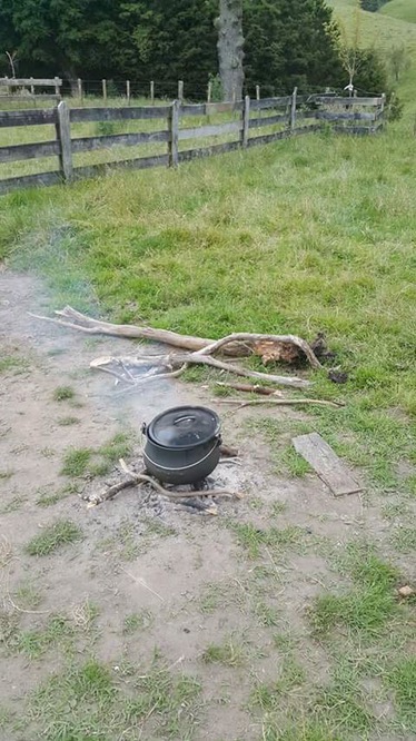 and take some coals from the camp fire about 5 good fist sized coals is all you need to cook the pot for the day..